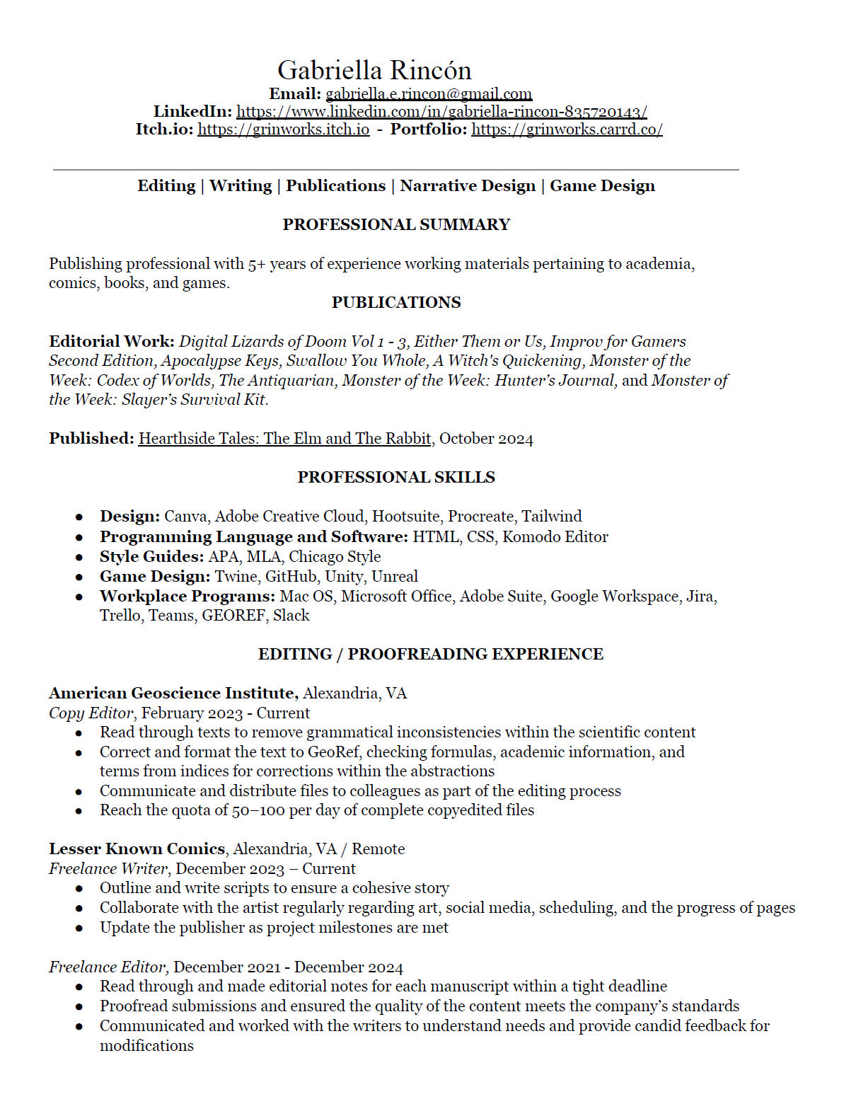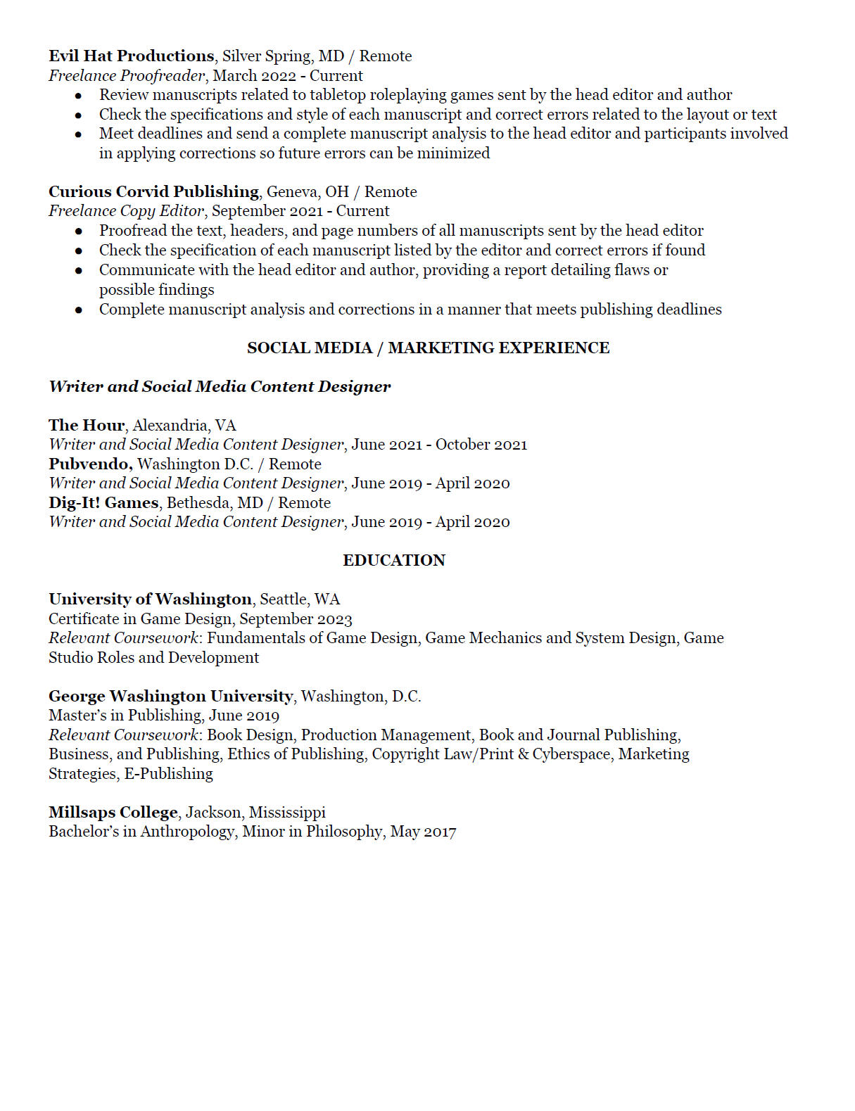 Professional proofreader, writer, and copy editor with experience in game and narrative design. I've worked on published projects including Digital Lizards of Doom, Apocalypse Keys, and Monster of the Week: Codex of Worlds. My professional skills encompass writing and editing technical and creative works for Lesser Known Comics, Curious Corvid Publishing, and Evil Hat Productions. I genuinely believe in the immortal impact of stories and in the people who work to tell them.